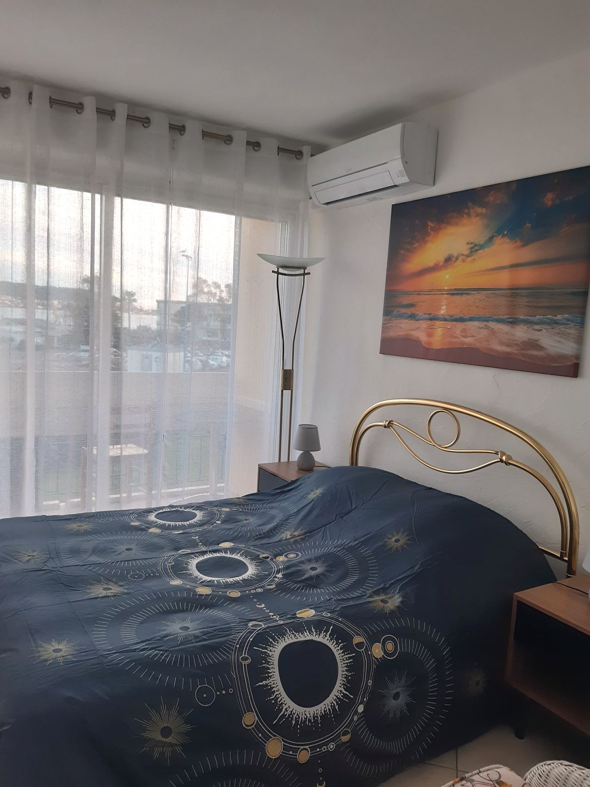 | la chambre avec un lit de 140 et les parures de couette aprés la pose de la climatisation | |