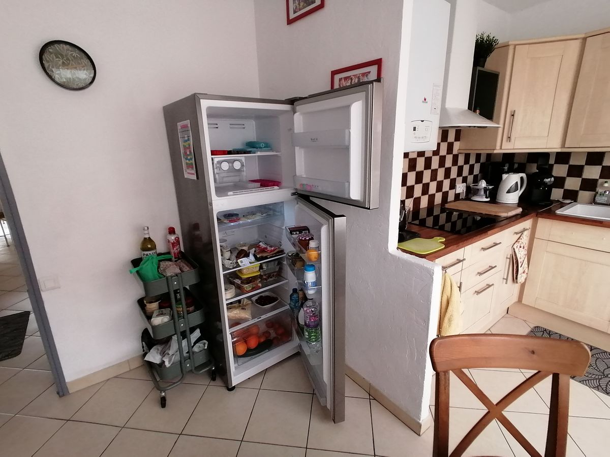| la cuisine avec le frigo congel ouvert | |