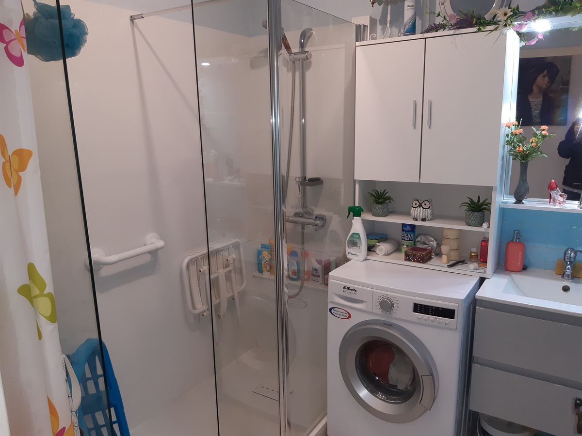 | la salle de bain avec une grande douche vitrée, siège et machine à laver | |